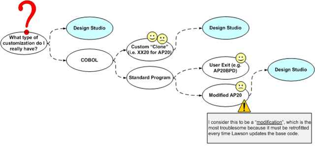 Within the scope of this article, it’s important to distinguish between what I refer to as a customization and a modification. I developed this diagram to help explain that you can often “customize” Lawson with Design Studio and/or User Exits with little or no future impact. However, cloning a program, or even worse, weaving your customizations into the base code should not be undertaken without understanding the business/financial risks that result and weighing the risk against the rewards.
