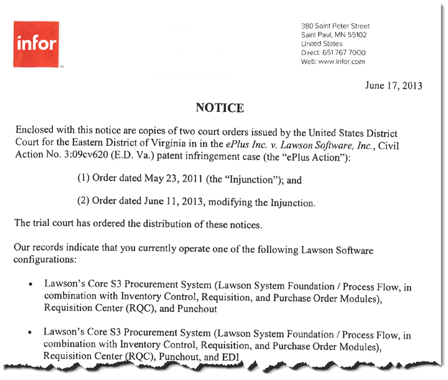 Several clients have asked for advice on a recent injunction against Lawson related to patent infringements alleged by ePlus.